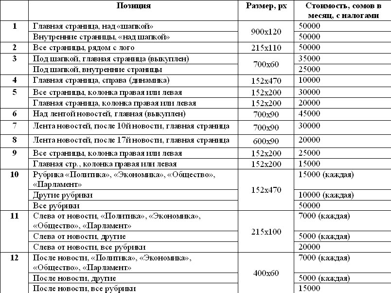 Предлагаем также размещение репортажей, интервью, аналитики (текст, на основе предоставленных фактов напишет профессиональный журналист ИА «24.kg»). Стоимость – 200 сомов 1 строка (56 знаков включая пробелы) + гонорар журналиста (зависит от объема и сложности материала; от 1000 сомов).